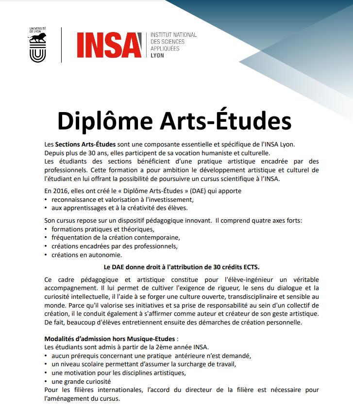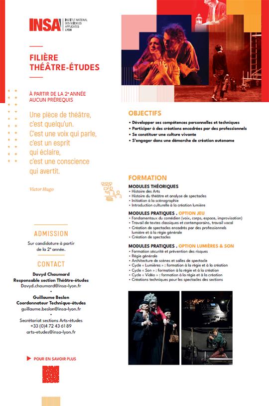 Pour candidater à la section théâtre-études, il faut d’abord être admis à l’INSA Lyon avant que votre demande soit examinée. Si la demande est refusée, le candidat garde le bénéfice de son admission en filière dite « classique ».